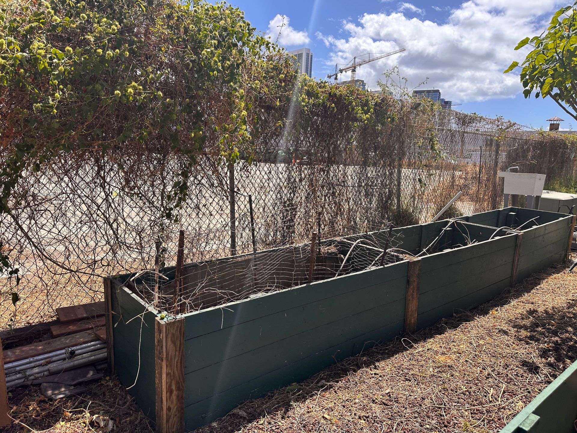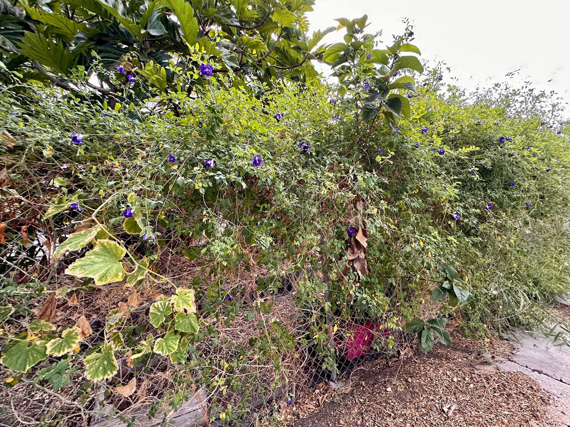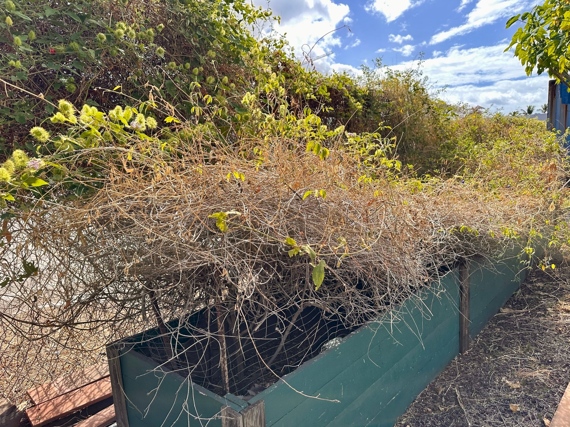 I started out in a section against the back fence with three large raised bed gardens filled with the withered remains of blue butterfly pea bushes. The bushes were entangled with lilikoi vines snaking their way over the fence, and chest-high weeds filled the area between the raised beds and fence, covering an outdoor sink.
