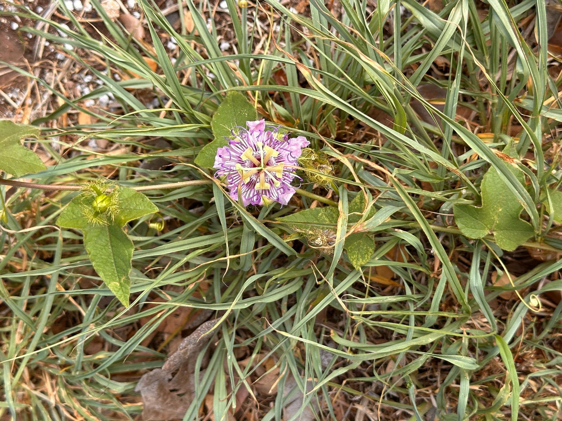 Located across from UH Manoa’s John A. Burns School of Medicine at the Kaka’ako waterfront, the garden is surrounded by a chain link fence but nature refuses to acknowledge the boundary: a volunteer lilikoi vine bursts forth with a striking purple bloom in the grassy area of the sidewalk…