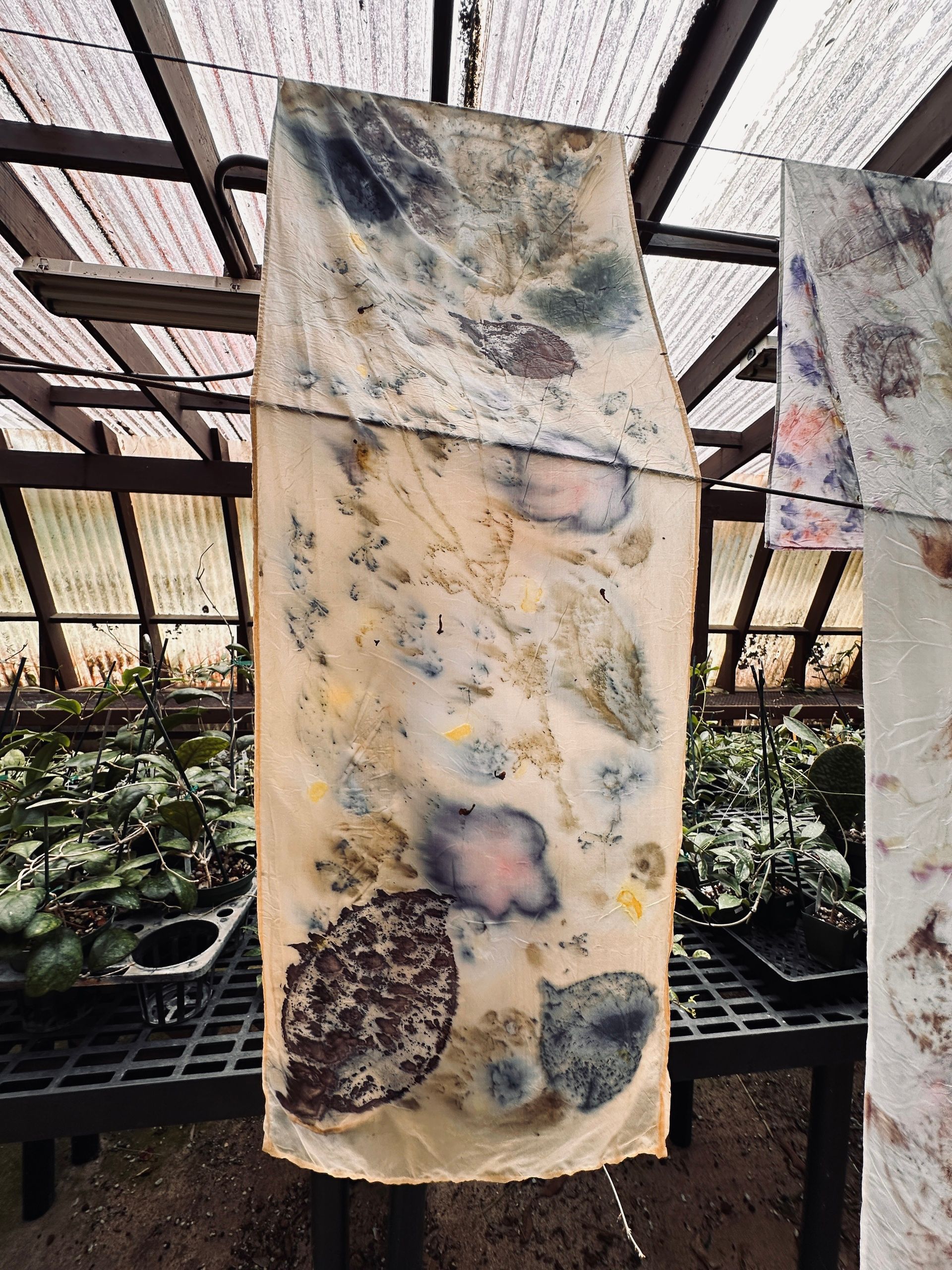 J. walked us through the entire process, explaining how eco-printing works. It's a natural dyeing technique where you transfer the pigments and shapes of plants directly onto fabric — in our case, a 11x60-inch silk scarf. It's a unique way to capture the beauty of your garden in wearable fashion!