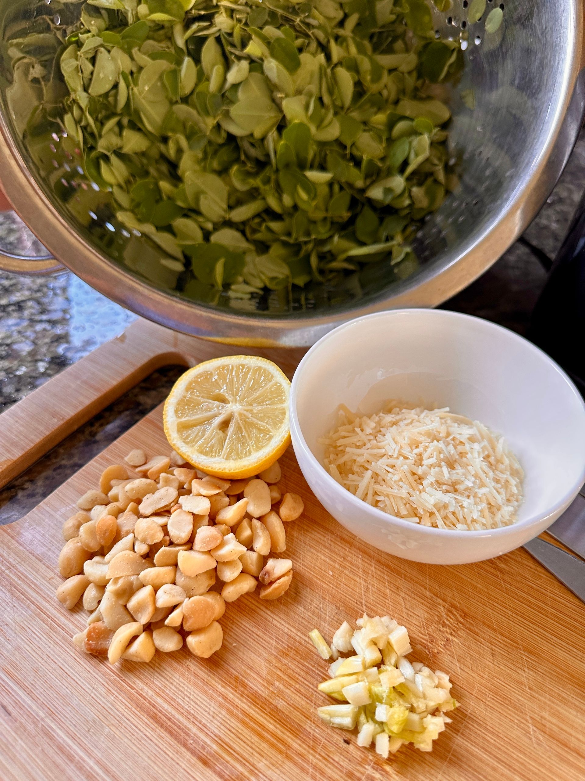 I typically make pesto with basil, but thought I’d try it with malunggay instead. While you can stick to an all-malunggay pesto, you could also add basil if you prefer a more traditional flavor. I also replace the traditional pine nuts with macadamia nuts for tropical flair.