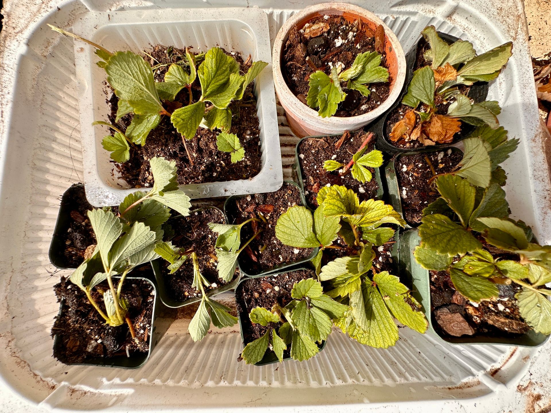 But now that they’re in the bed, the runners escape and dangle over the sides … so I decided to try to cut the runners and propagate the daughters anyway. I haven’t had much success at this in the past, but I hate to just throw away the daughter plants.