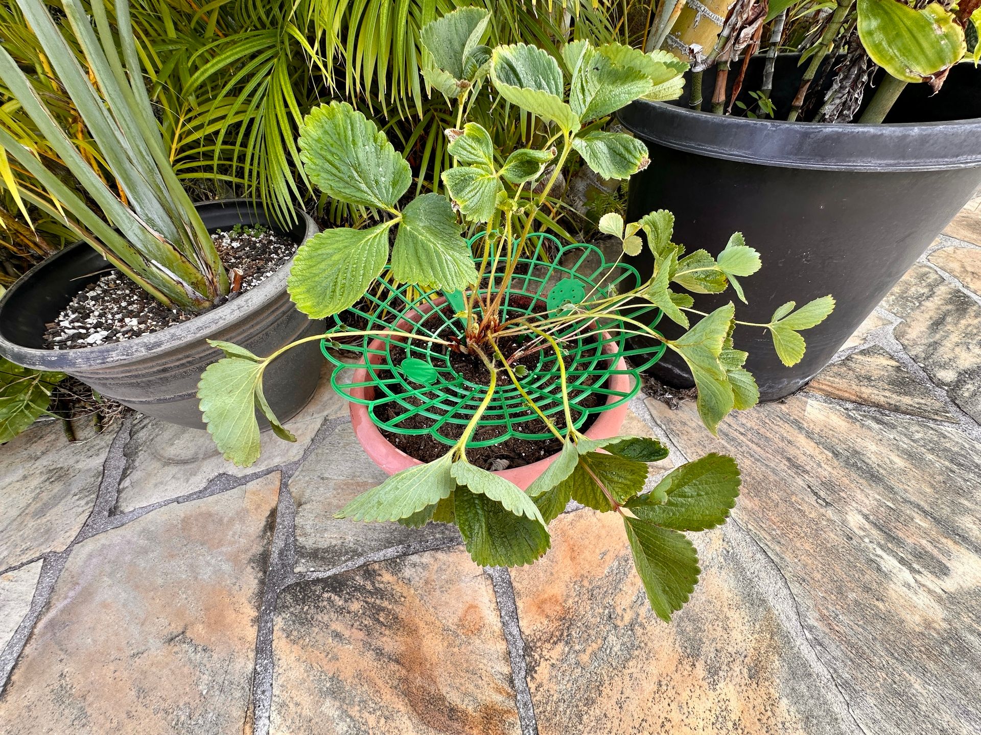Because the bed is so overgrown, I decided to remove some of them and place them back in single pots- but this time with a fancy device to keep the leaves and potential strawberries off the soil.